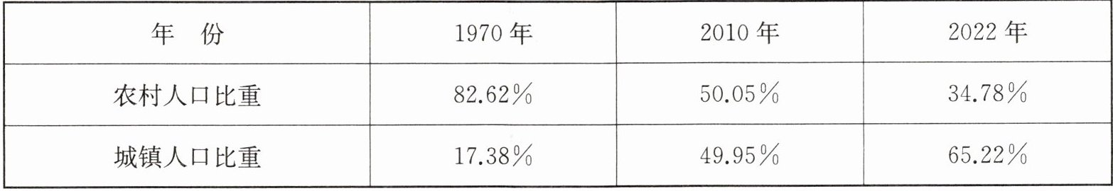 阅读不同年份中国城镇人口与农村人口比重统计表,完成第7~8题。