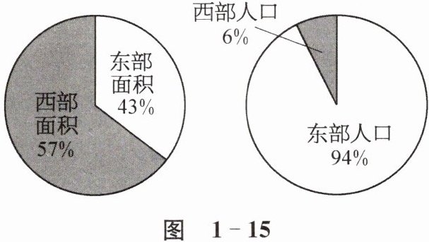 16. 读图 1 - 15“我国东、西部面积比例与人口比例”,回答下列问题。