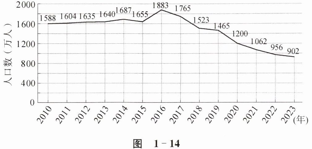 读图 1 - 14“2010 年至 2023 年我国出生人口数量统计”,完成第 13~15 题。