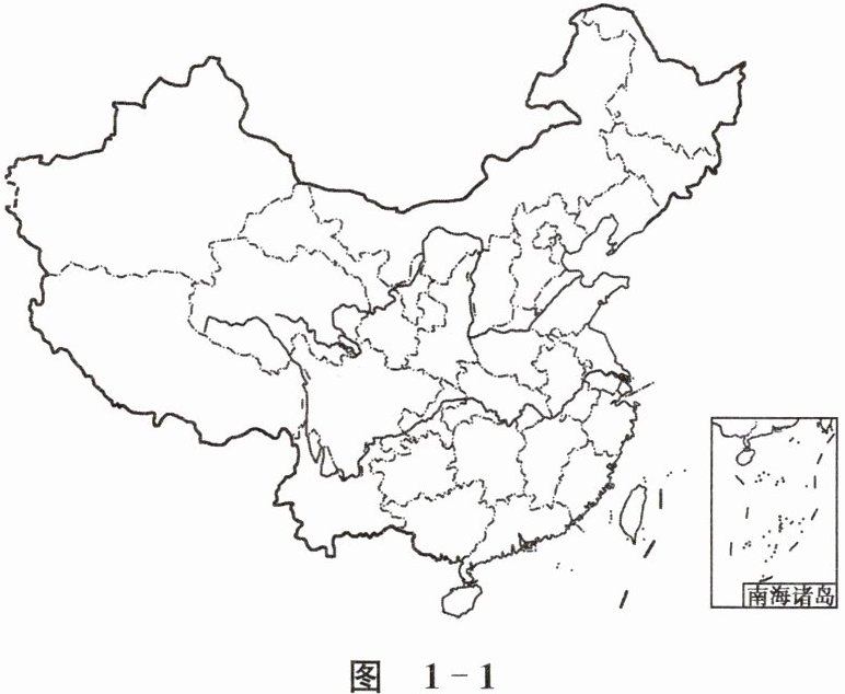 (1)在图 1 - 1 中适当位置填注我国的四个邻海:渤海、黄海、东海、南海;两大海峡:台湾海峡、琼州海峡;三大半岛:辽东半岛、山东半岛、雷州半岛;两大岛屿:台湾岛、海南岛。其中属于内海的是、;面积最大的邻海是;面积最小的邻海是;位于热带的邻海是。