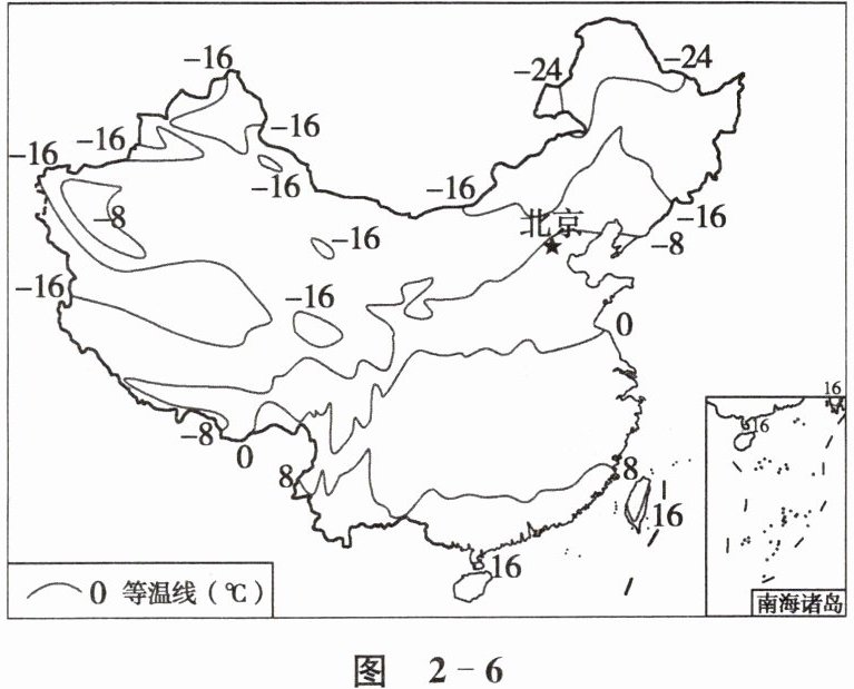 读 图 2 - 6“中国 1 月等温线分布”,完成第 7~9 题。