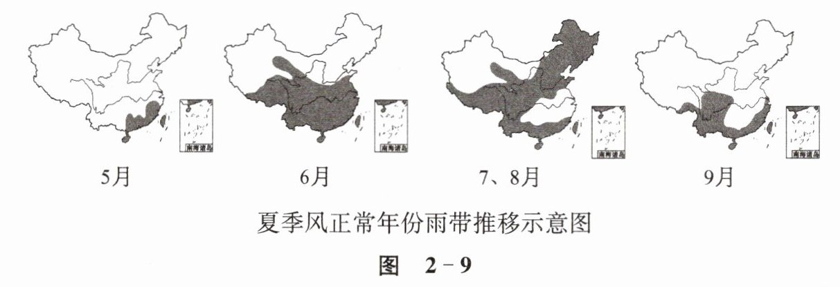 (5) 读图 2 - 9,理解夏季风的进退与我国东部雨带推移的关系(阴影表示雨带)。