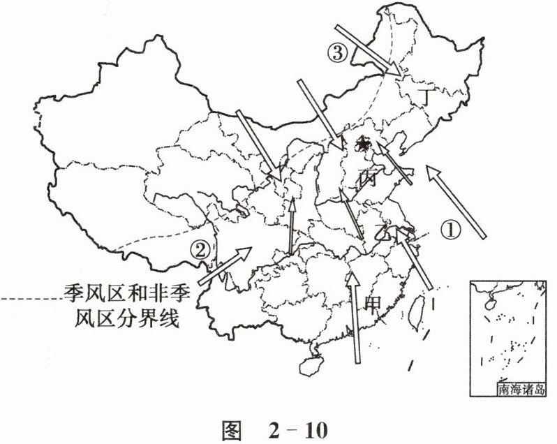 读图 2 - 10“我国季风区与非季风区分布示意”,完成第 4 ~ 7 题。
