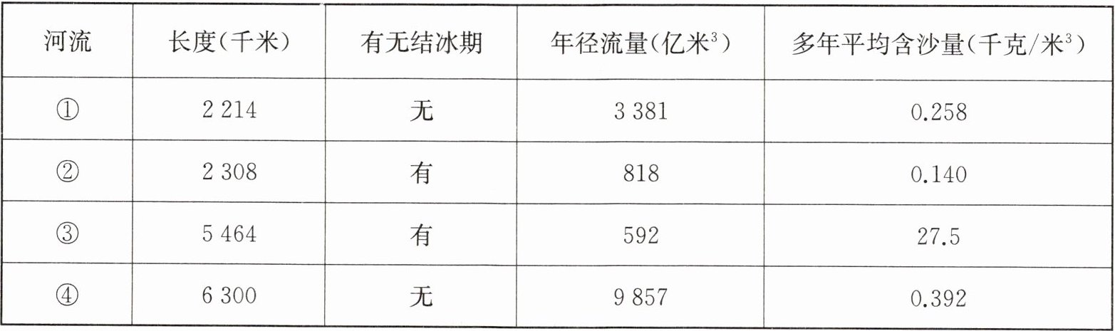 下表为松花江、黄河、长江、珠江四条河流的水文特征对比。据此完成第 4~6 题。