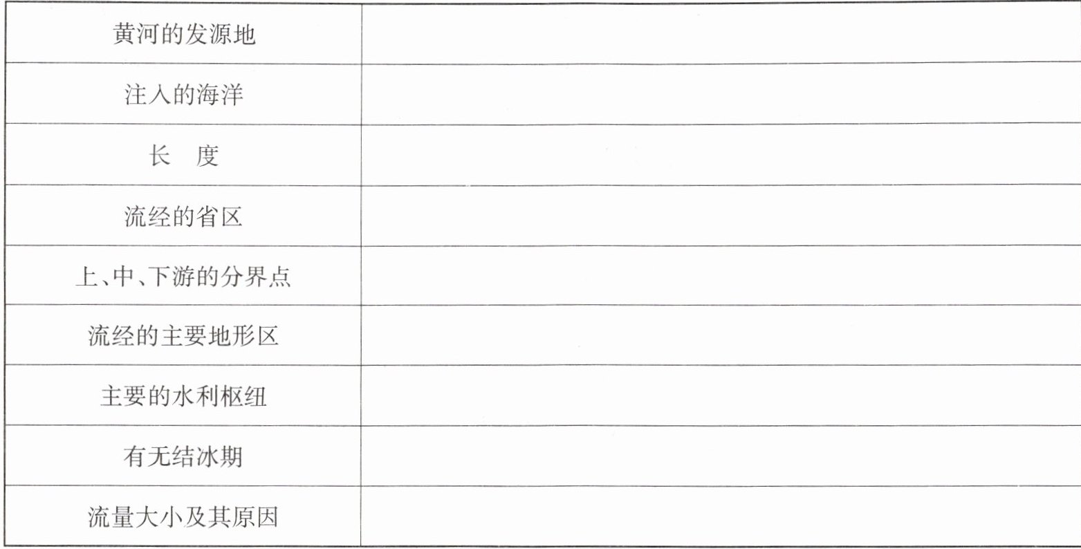 (1)发源地:青藏高原巴颜喀拉山脉;注入的海洋:渤海;长度:约5464千米;流经的省区:青海、四川、甘肃、宁夏、内蒙古、陕西、山西、河南、山东;上、中、下游的分界点:河口、桃花峪;流经的主要地形区:青藏高原、内蒙古高原、黄土高原、华北平原;主要的水利枢纽:龙羊峡、刘家峡、三门峡、小浪底;有无结冰期:有;流量大小及其原因:流量较小,原因是流经干旱、半干旱和半湿润地区,降水较少,蒸发量大,沿岸工农业用水量大。