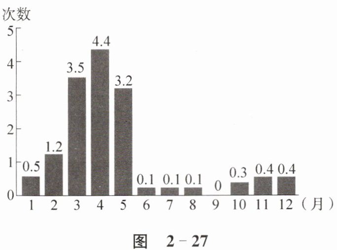 读图 2 - 27“近 20 年我国沙尘天气各月平均次数统计”,完成第 3~5 题。
