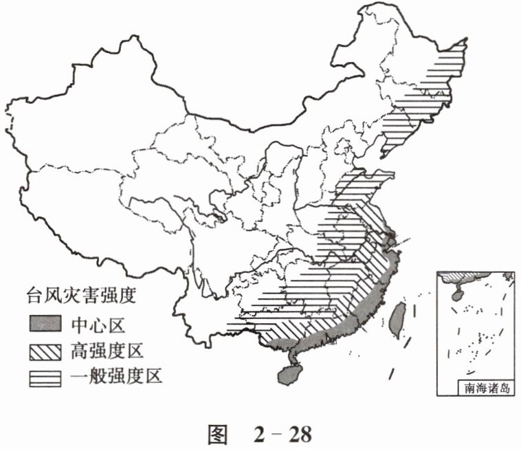 我国是受台风灾害影响较大的国家。读图 2 - 28“我国台风灾害强度分布”,完成第 6~7 题。
