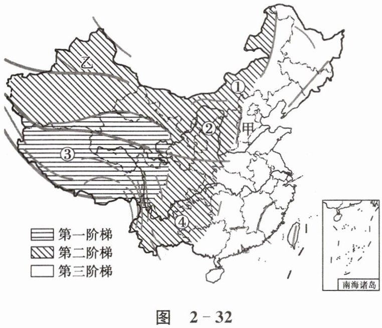 读图2-32“中国地势三级阶梯示意”,完成第1~4题。