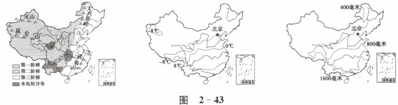 探究资料:图2-43为我国地势三级阶梯分布图、我国1月平均气温分布图和我国年降水量分布图。