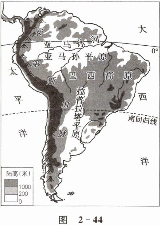 学以致用:读图2-44“南美洲地形、河流分布图”。