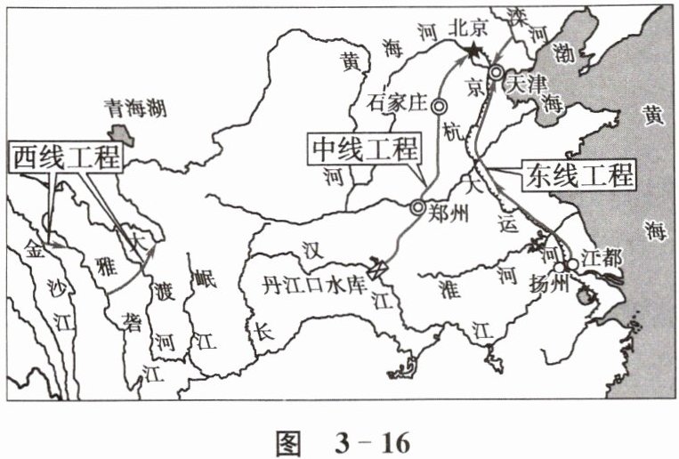 读图 3 - 16“南水北调工程线路示意”,完成第 9~10 题。