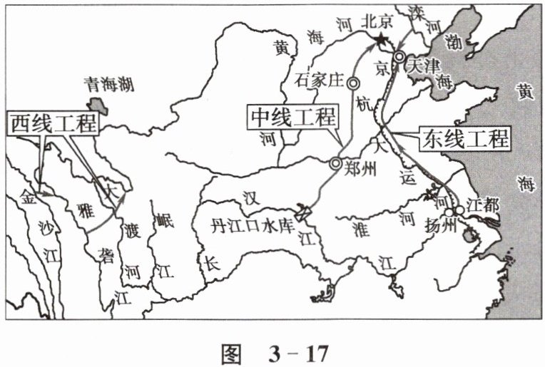 11. 华北地区耕地占全国的 40%,而水资源仅占全国的 6%,且降水集中于夏季,冬春降水少,春旱严重。华北地区人口众多,工农业及生活用水量大,淡水供应紧张。图 3 - 17 是我国南水北调工程线路示意图。据此回答下列问题。