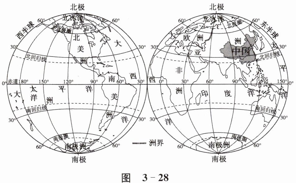 23. 我国是海洋大国,拥有漫长的海岸线、广袤的管辖海域和丰富的海洋资源。南海为中国四大近海中面积最大、水最深的海区。这一海域石油储量至少230亿~300亿吨;天然气20万亿立方米,鱼类1500多种,每年有超过4万艘运送各类货物的船只经过南海海域。图3-28为中国在世界的位置示意图,据此完成下列问题。