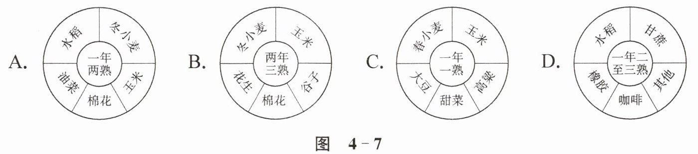 2. 图 4 - 7 所示为耕作制度及其对应的主要农作物结构图,其中最符合华北平原实际情况的是(