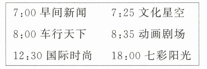 解:《车行天下》从$8:00$开始,下一个节目$8:35$开始,所以播放时间为$8$时$35$分$-8$时$ = 35$分钟。