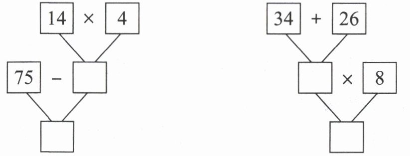 从上到下,从左到右,左图:56,19;$75 - 14×4 = 19$;右图:60,480;$(34 + 26)×8 = 480$。