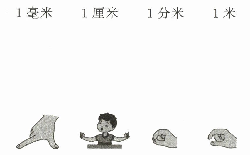 1. 小明用手分别比画 1 毫米、1 厘米、1 分米和 1 米的长度,请你连一连。(4 分)