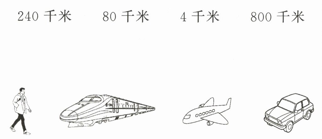 行走—4千米,高铁—240千米,飞机—800千米,汽车—80千米