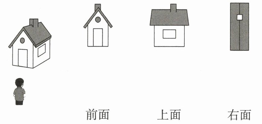从前面看到的是中间有圆形窗户、带烟囱且底部有门的房子图形,与第二个图(前面标有“前面”的图形)相连;