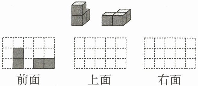 将其绘制在“上面”对应的方格中(由于无法直接绘制图形,这里用文字描述图形形状):从上面看,左边部分是两列,每列$1$个正方形;右边部分是三列,每列$1$个正方形。