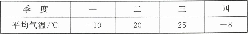 |平均气温/$^{\circ}C$|$-10$|20|25|$-8$|
