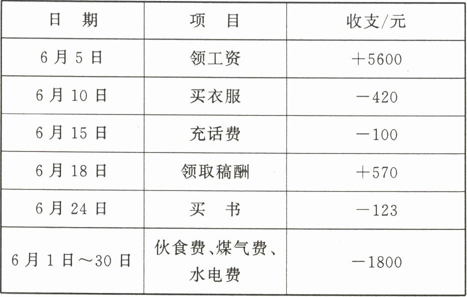 |6月1日~30日|伙食费、煤气费、水电费|$-1800$|