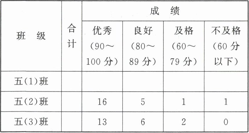 | 班级 | 合计 | 优秀(90~100分) | 良好(80~89分) | 及格(60~79分) | 不及格(60分以下) |