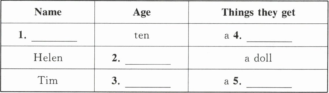 1. Mike 2. nine 3. five 4. robot 5. toy car