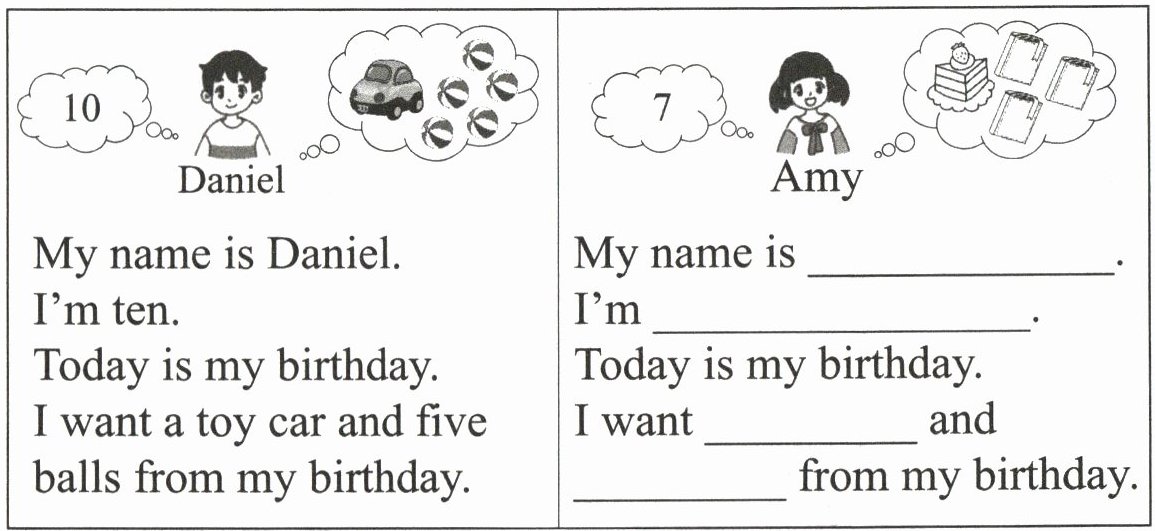 | My name is Daniel. I'm ten. Today is my birthday. I want a toy car and five balls from my birthday. | My name is ______. I'm ______. Today is my birthday. I want ______ and ______ from my birthday. |
