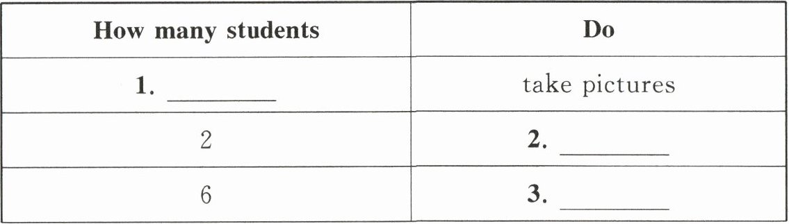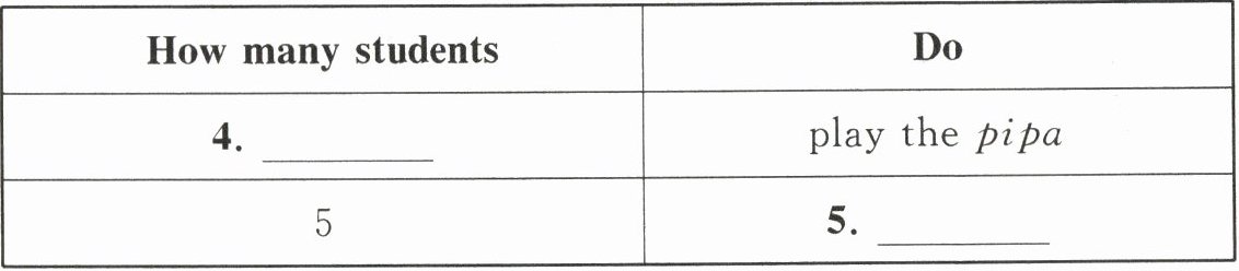 1. 4 2. draw cartoons 3. dance 4. 2 5. sing English songs