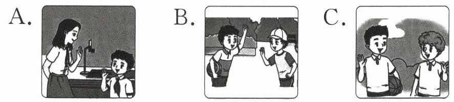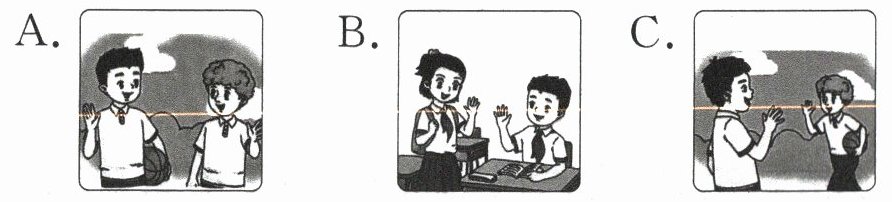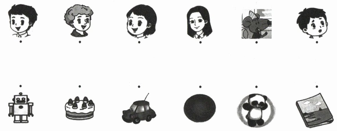 从左到右,第一行人物依次与第二行对应的机器人、蛋糕、球、玩具车、熊猫玩偶、书连线(具体连线情况根据实际录音内容确定,这里只是假设示例)。