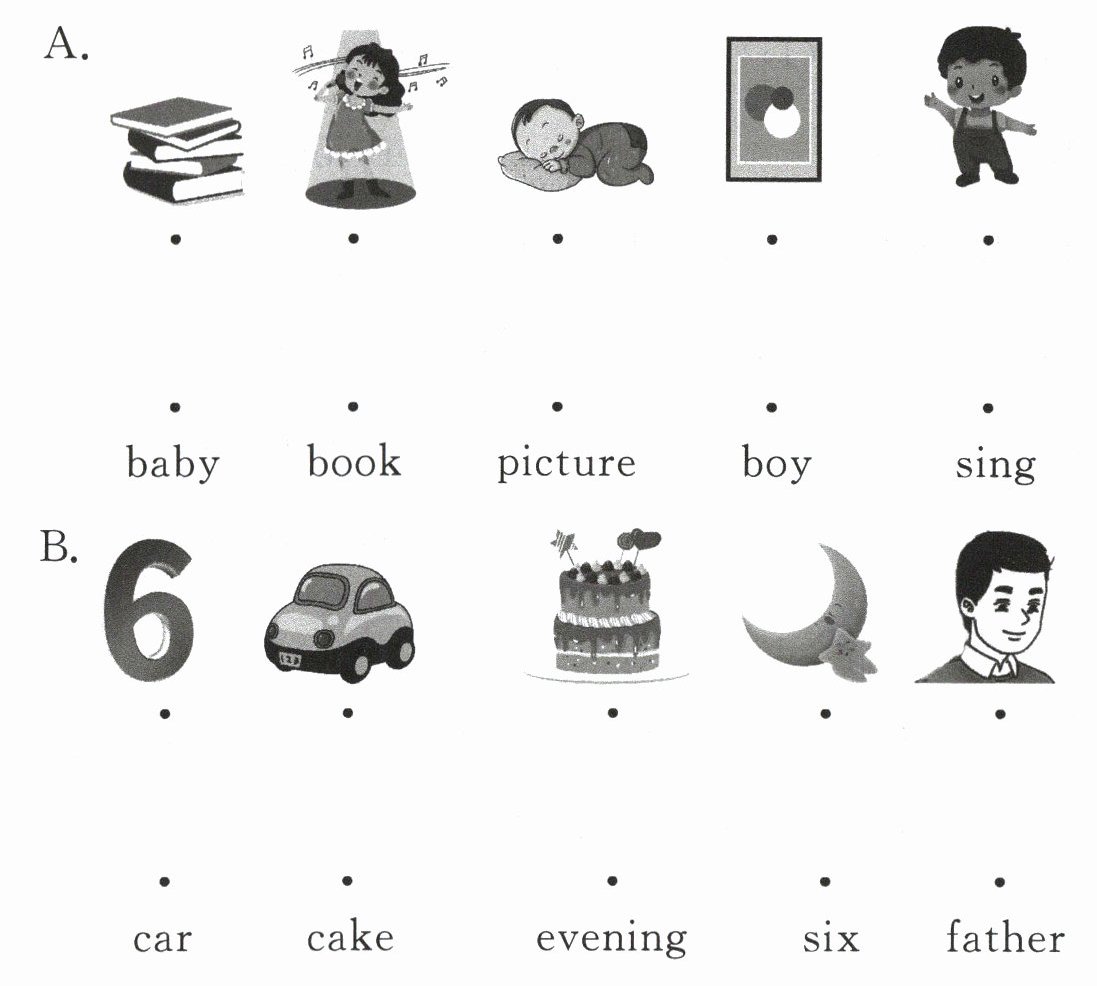 A组单词与图片连线顺序为:book、sing、baby、picture、boy;B组单词与图片连线顺序为:six、car、cake、evening、father 。(按照从上到下,从左到右的顺序,将A组单词与对应图片下方的点用直线相连,B组同理)