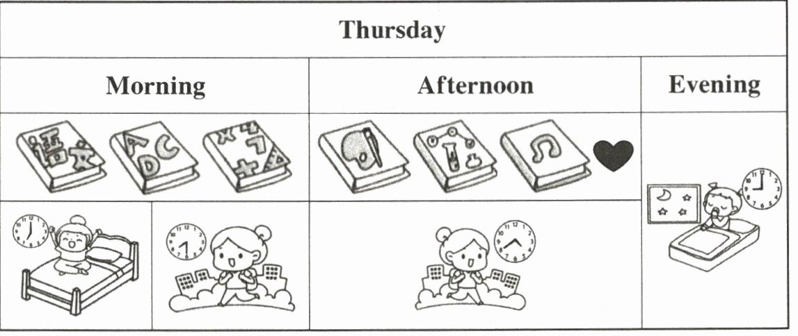 Hello! My name is Amy. It is Thursday today. In the morning, I get up at six thirty. I go to school at seven thirty. I have Chinese, English and Maths. In the afternoon, I have Art, Science and Music. I like Music very much. I go home at four thirty. In the evening, I go to bed at nine o'clock.