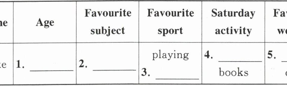 | Name | Age | Favourite subject | Favourite sport | Saturday activity | Favourite weather |
