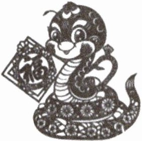 说明:这张窗花整体为红色,主体是一条蛇,蛇身上有花纹装饰,蛇嘴里衔着一个写有“福”字的物品。