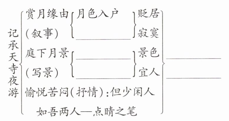 (1)山川之美,古来共谈;清流见底;四时俱备;晨昏;自康乐以来,未复有能与其奇者;念无与为乐者;庭下如积水空明;水中藻、荇交横;空明澄澈;幽静美妙