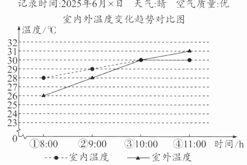 9. ①(8:00)通风效果最好。此时室内温度(约28℃)高于室外温度(约26℃),温差约2℃,为四个时间点中最大。根据“热压通风”原理,温差越大,空气流速越快,换气效果越显著,故8:00开窗通风效果最佳。