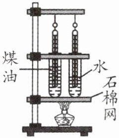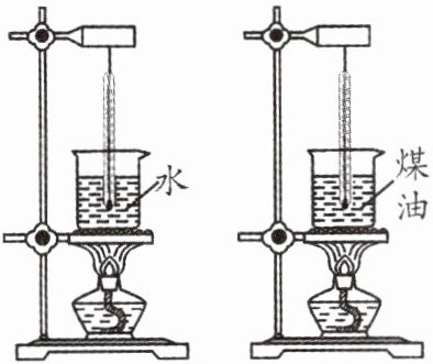 2. 如图所示,隔着石棉网同时加热两支规格相同的试管,试管中分别装有质量相同、初温均为 $20℃$ 的煤油和水。若加热时间相同,则煤油和水吸收的热量