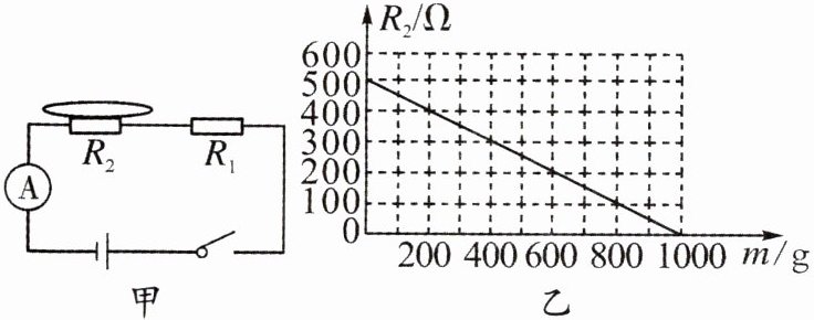 19. 如图甲是某电子秤的原理示意图,$R_{1}$的阻值为 100 Ω,托盘下方的电阻$R_{2}$为压敏电阻,其电阻大小与托盘内所放物体质量 m 大小的关系如乙图所示,电源电压为 6 V 保持不变,则(
