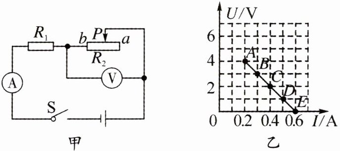 17. 如图甲所示电路,电源电压不变,$R_{1}$为定值电阻。闭合开关 S,将滑动变阻器$R_{2}$的滑片 P 从最右端移动到最左端的过程中,电压表和电流表的示数变化情况如图乙所示,滑动变阻器$R_{2}$的最大阻值是