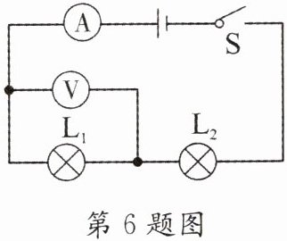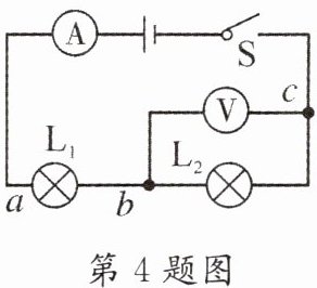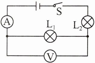 4. 如图所示是某同学做实验时的电路图。闭合开关 S 后,发现灯泡 L₁、L₂均不亮,电流表示数为零,电压表示数等于电源电压,则该电路中的故障是(