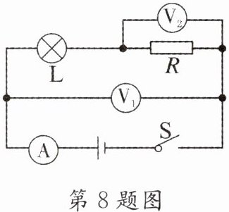 8. 如图所示的电路,电源电压保持不变,开关 S 闭合时,发现只有两个电表的指针发生偏转,电路中的电阻 R 或灯 L 有一个出现了故障,则可能是(