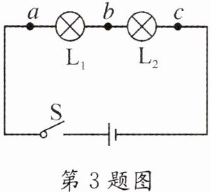 3. 小明用如图所示的电路来探究串联电路的电压关系。已知电源电压为 6V,当开关 S 闭合后,发现两灯均不亮。他用电压表分别测 a、c 和 a、b 两点间的电压,发现两次电压表示数均为 6V,由此判定灯