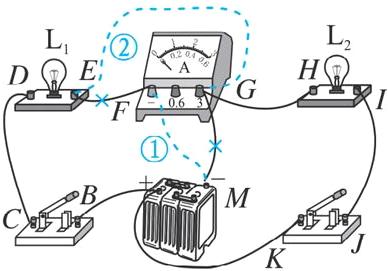 (3)在第(2)问已改动的基础上,若要测量通过L₁、L₂两灯的电流之和,而且又只允许再变动一根导线上的一个端点的接线位置,请在图中再用虚线标出,并在其旁边标上②字样。