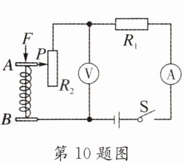 10. 如图所示是童童设计的压力传感器的原理图,其中弹簧上端和滑动变阻器的滑片 P 固定在一起,AB 间有可以收缩的导线,R₁ 为定值电阻。当闭合开关 S,压力 F 增大时,电流表与电压表的示数变化情况是(