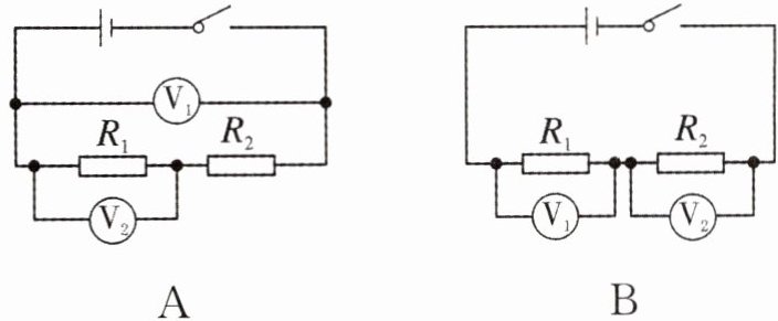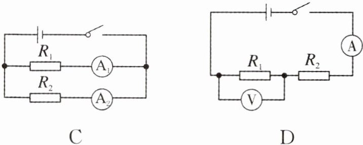 8. 为了测量 R₂ 阻值的大小,R₁ 是定值电阻且阻值已知,电源电压未知。四位同学分别设计了如图所示的电路,其中