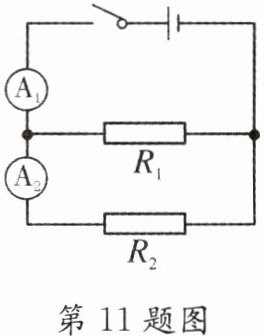 11. 在如图所示的电路中,电源电压恒为 24 V,电阻 R₁ = R₂ = 120 Ω,两只电流表的量程均为 0~0.6 A,当闭合开关时,两只电流表的示数均为 0.2 A,若故障由这两个电阻中的其中一个引起,则出现的故障是(