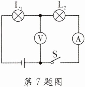 7. 如图所示电路,电源电压恒定为 12 V,L₁、L₂ 为两只相同的灯泡,灯泡的额定电压为 12 V,灯丝电阻为 24 Ω 且保持不变,电压表和电流表连接完好。当闭合开关 S 时,发现灯 L₁ 不发光,灯 L₂ 发光,则此时电压表和电流表的示数分别为(