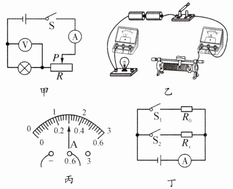 (选填“变化”或“不变”)。(4)小明又想测某未知电阻 Rₓ 的阻值,设计了如图丁所示的电路(R₀ 为已知阻值的定值电阻),并设计了如下实验步骤,请帮他把缺少的步骤补全,并写出 Rₓ 的表达式。