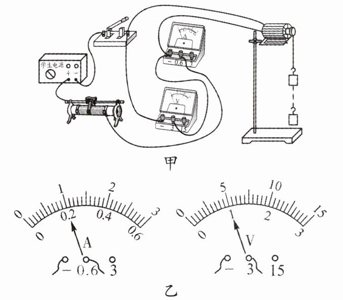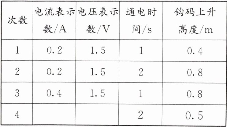 【例题 4】利用如图甲所示的实验装置探究“电流做功多少跟什么因素有关”。将质量一定的钩码通过细线挂在定滑轮下面,闭合开关,电动机将钩码提升得越高,表明电流做的功越多,电路中的电源电压可调,电压表测量电动机两端的电压,电流表测量通过电动机的电流,现将测得的实验数据记录在下表中。